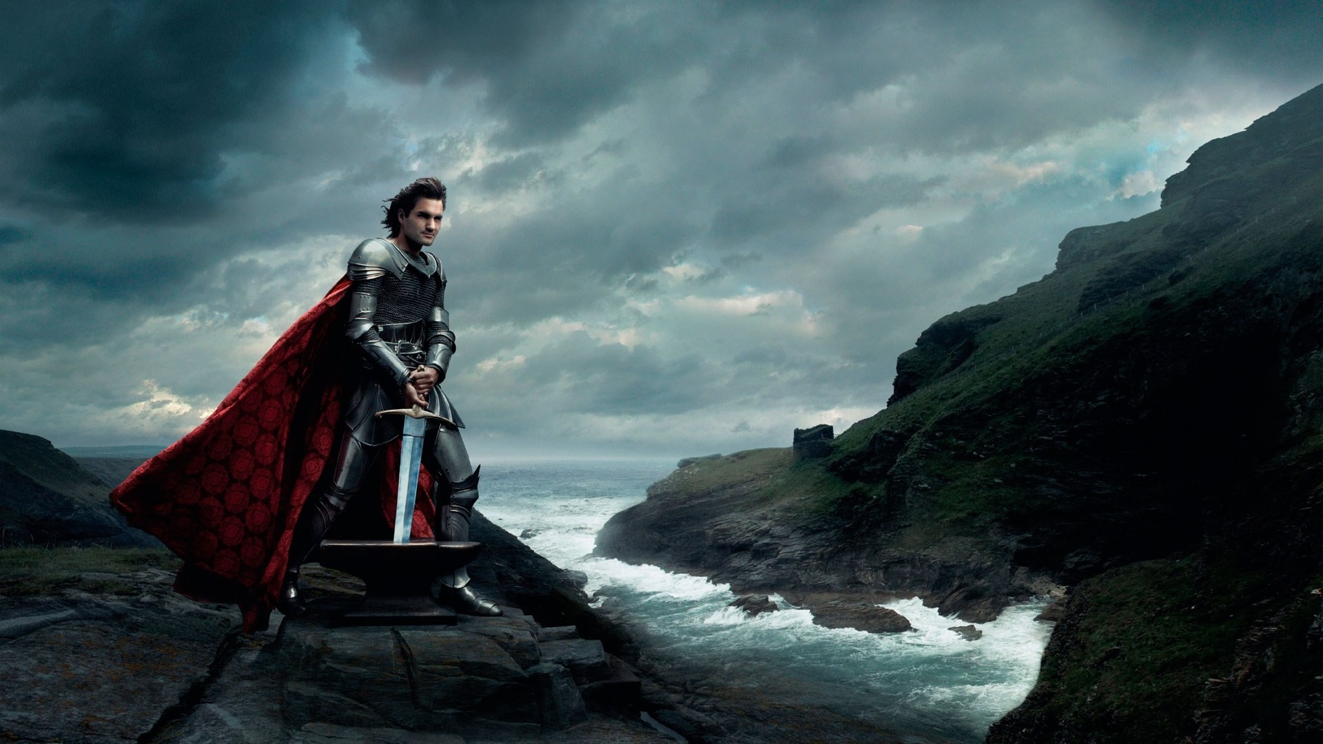 Uomo con una spada su una montagna vicino a un fiumeUomo con una spada su una montagna vicino a un fiume