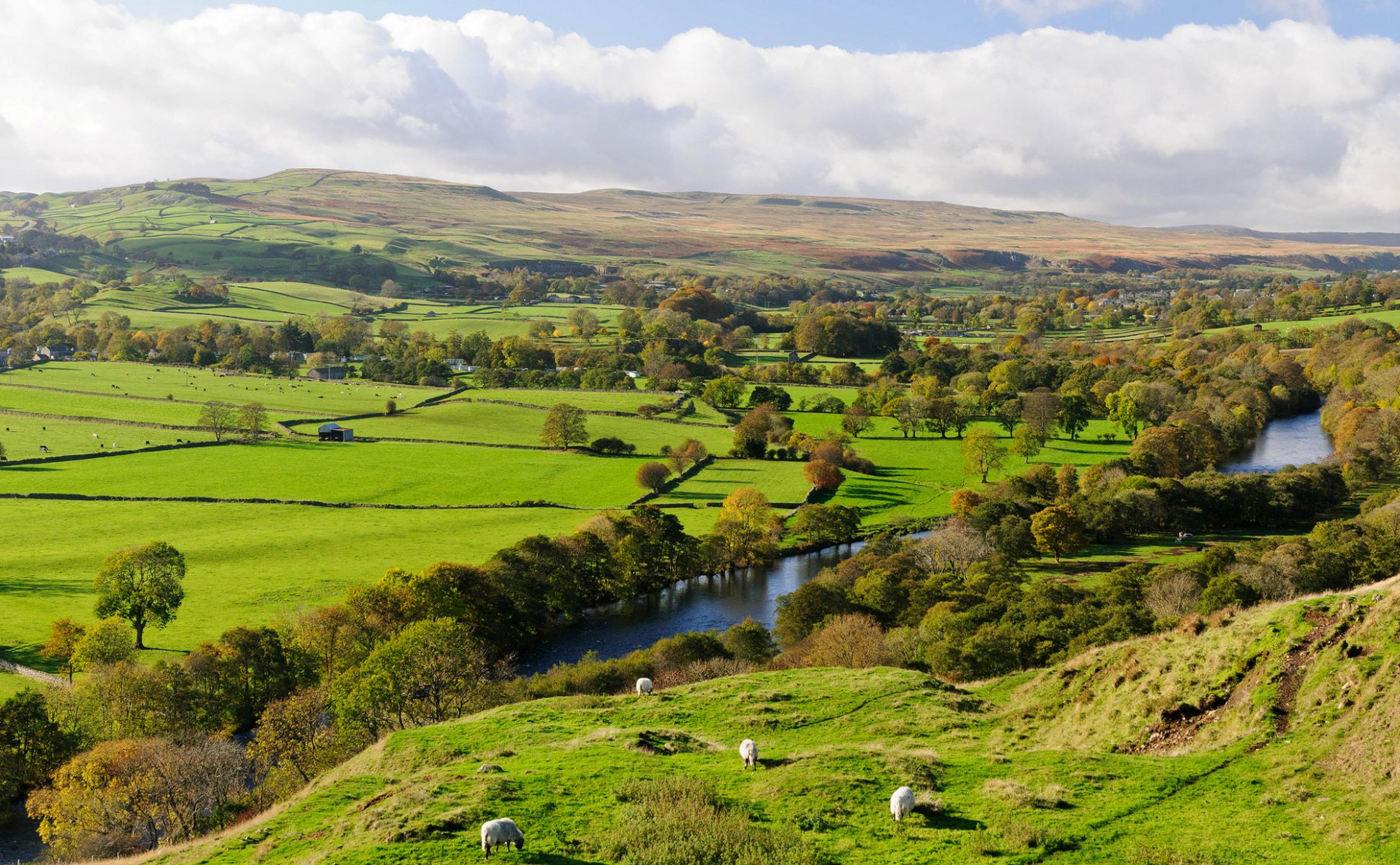 Pecore che camminano sulle colline vicino al fiume